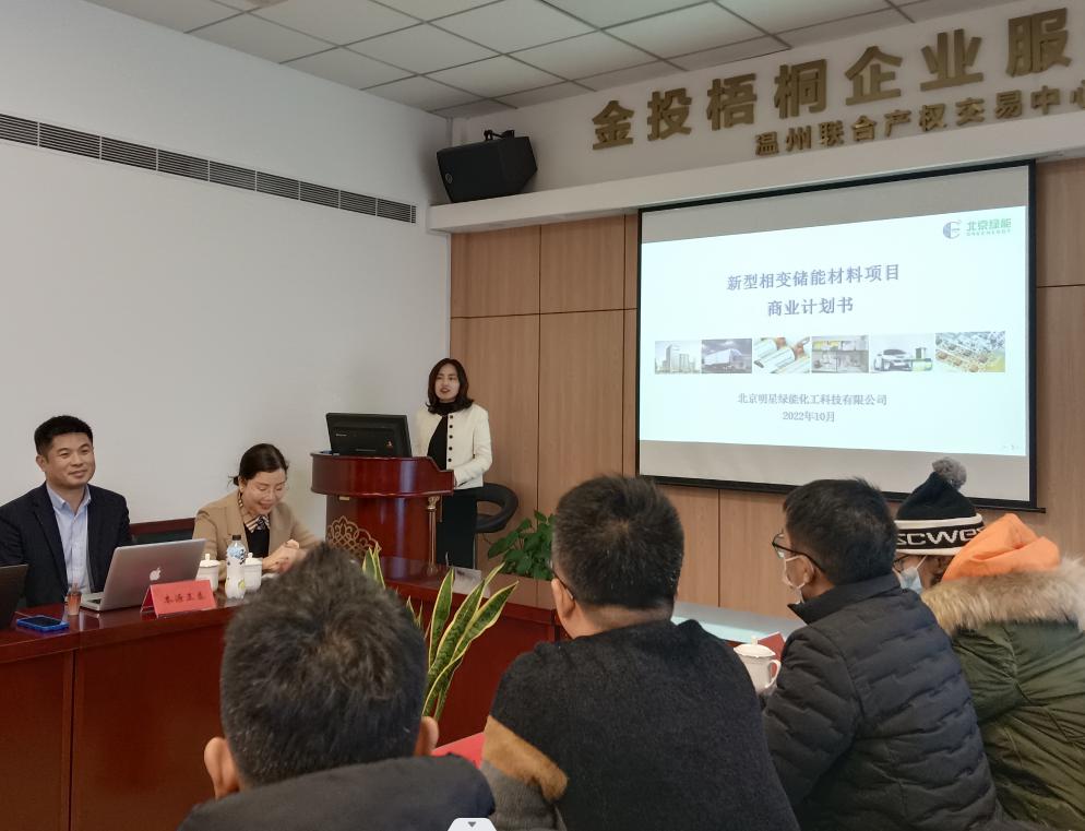 為積極響應市委市政府招商引智工作部署,幫助招商項目對接當?shù)赝顿Y機構(gòu),緩解項目融資難題,加快推薦項目落地溫州。1月16日,溫州聯(lián)合產(chǎn)權(quán)交易中心成功舉辦“2023金投梧桐企業(yè)服務沙龍暨‘機構(gòu)聚能 金融助企’——北京明星綠能招商項目專場路演”活動。“溫資金融服務團”及其它數(shù)十幾家投資機構(gòu)、產(chǎn)業(yè)園區(qū)等負責人踴躍參與。本源正泰(北京)投資有限責任公司和北京明星綠能化工科技有限公司就“新型相變儲能材料項目”進行綜合路演。