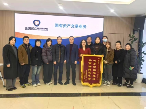 近日,溫州濱江置地有限公司(以下簡稱“濱江置地”)將一面印有“心系企業(yè)服務(wù)好、辦事快捷效率高”字樣的錦旗送至溫州聯(lián)合產(chǎn)權(quán)交易中心(以下簡稱“聯(lián)交中心”)資產(chǎn)交易一部,以表達(dá)對(duì)聯(lián)交中心在股權(quán)轉(zhuǎn)讓和資產(chǎn)轉(zhuǎn)讓業(yè)務(wù)中提供高效、專業(yè)服務(wù)的感謝。這不僅反映了聯(lián)交中心近年來不斷提升優(yōu)質(zhì)服務(wù)的良好口碑,也展現(xiàn)了其在助力國企改革中的重要作用。
