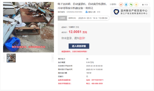 近日,溫州聯(lián)合產(chǎn)權(quán)交易中心成功助力浙江金海蘊(yùn)生物股份有限公司完成一批廢舊機(jī)器設(shè)備處置,以1.8萬(wàn)元起拍價(jià)經(jīng)近40輪激烈競(jìng)價(jià),最終以12萬(wàn)元成交,溢價(jià)率高達(dá)565.07%,創(chuàng)下平臺(tái)廢舊資產(chǎn)處置領(lǐng)域新紀(jì)錄。這一成績(jī)不僅彰顯了國(guó)有產(chǎn)權(quán)交易市場(chǎng)的活力,更成為“盤活存量資產(chǎn)、釋放資源價(jià)值”的典范案例。