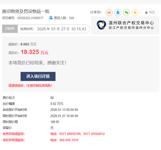 近日,溫州市龍灣區(qū)綜合行政執(zhí)法局委托溫州聯(lián)合產(chǎn)權(quán)交易中心有限公司(以下簡稱“溫州產(chǎn)權(quán)”)在“浙交匯”平臺掛牌的廢舊物資及罰沒物品一批轉(zhuǎn)讓項目順利成交。該項目掛牌價為8.665萬元,經(jīng)86輪激烈競價,最終以18.325萬元成交,溢價達9.66萬元,溢價率顯著,充分體現(xiàn)了市場認可度。