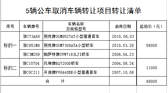 拍賣標(biāo)的及起拍價:標(biāo)的一溫州方圓計量校準(zhǔn)有限公司3輛公務(wù)用車取消車輛,起拍價:58000元;標(biāo)的二溫州水利電力勘測設(shè)計院2輛公務(wù)用車取消車輛,起拍價11000元。